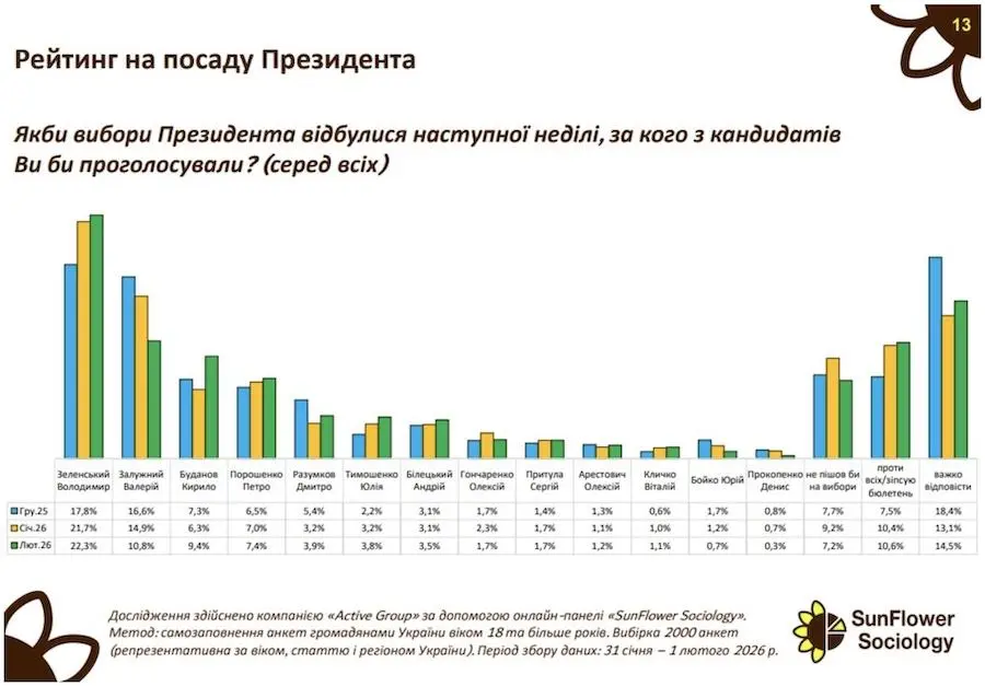 Наразі найвищий показник підтримки серед потенційних кандидатів у президенти має чинний глава держави Володимир Зеленський — 22,3%, що свідчить про поступове зростання його рейтингу впродовж останніх місяців: з 17,8% у грудні 2025 року та 21,7% у січні 2026-го.
