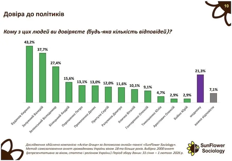 Найвищий рівень довіри фіксується у Кирила Буданова — йому довіряють 43,2% респондентів, що є найвищим показником у переліку. Далі йдуть Валерій Залужний (37,7%) та Володимир Зеленський (27,4%).